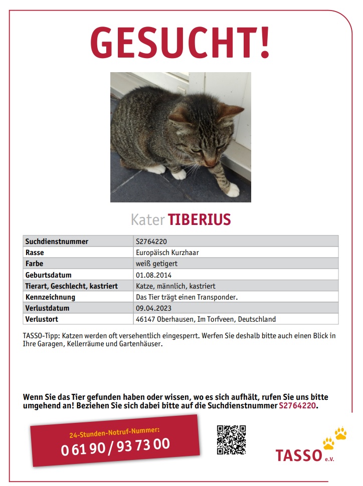Unser geliebter Kater Tiberius hat am Ostersamstag, 03.04.2023, das Haus verlassen und ist leider nicht mehr nach Hause gekommen.
