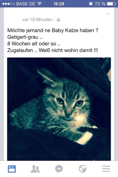 Tiberius ist am 09.10.2014 bei uns eingezogen. Er ist wohl irgendwo in Duisburg Mitte August 2014 im Wurf einer Hinterhof-Katze geboren worden. Der Besitzer wollte die Katzenbabys schnell loswerden. Ein Mädel, das gerade bei seinen Elterns ausgezogen war, wollte dann ein Katzenbaby und hat zwei angedreht bekommen. Da sie aber nur eine Katze wollte, war eine kleine Katze dann aber über. Und das war der Tiberius. Der arme war voll mit Flöhen, als wir ihn bekommen haben. Jetzt (07.04.2015) ist er entfloht, entwurmt, kastriert, gechipt und geimpft und seit wenigen Tagen eine Outdoor-Katze. Soeben hat er gelernt, alleine durch die Katzenklappe zu gehen.